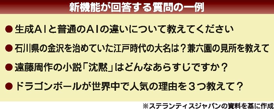 ステランティスジャパン(打越晋社長、東京都港区)が、生成AI(人工知能)「チャットGPT」を使用した車と対話できる機能をDSオートモビル車に実装した。3月以降に新規登録し、コネクテッドサービスを使用するユーザーが利用できる。乗員の呼び掛け...