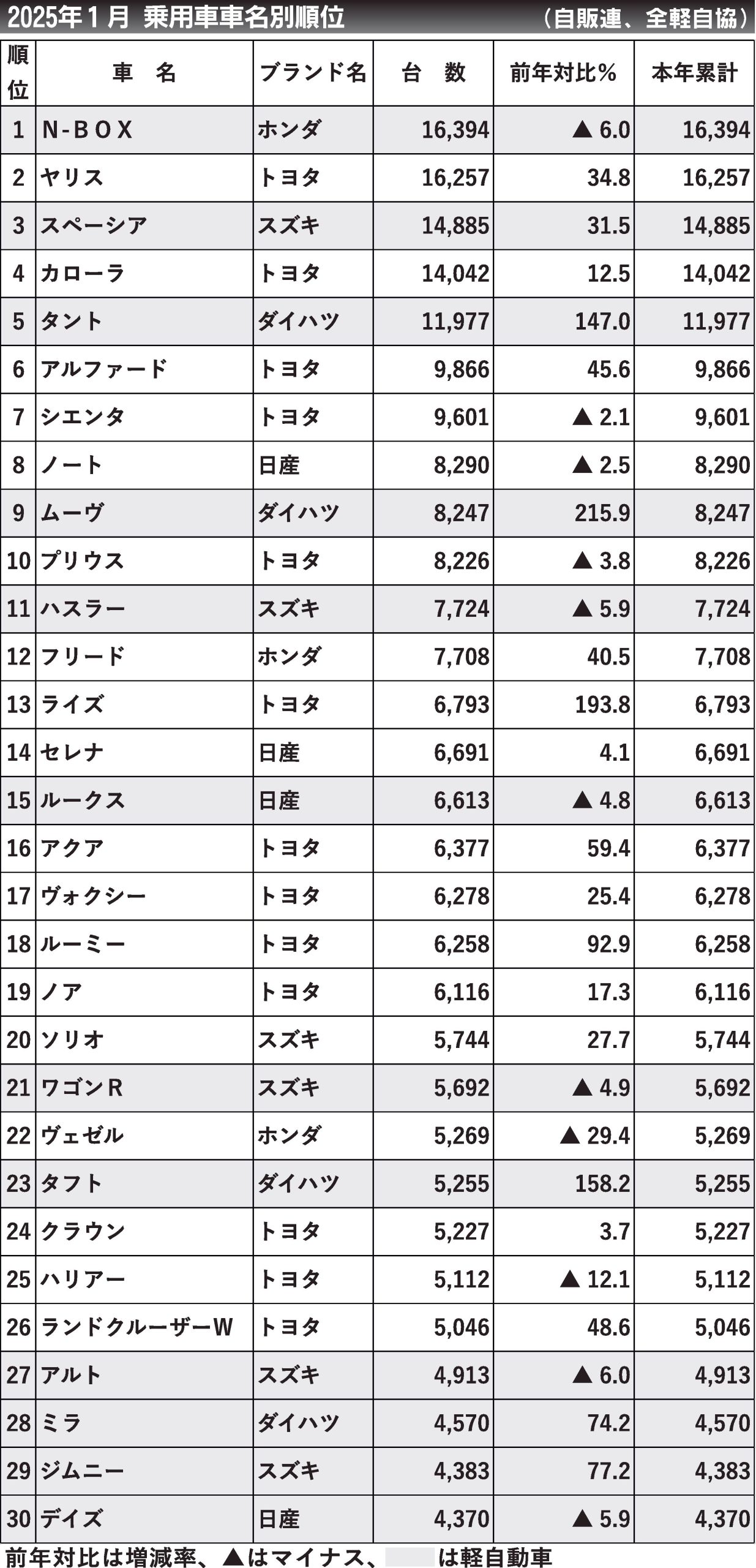 〈2025年1月 乗用車車名別順位〉