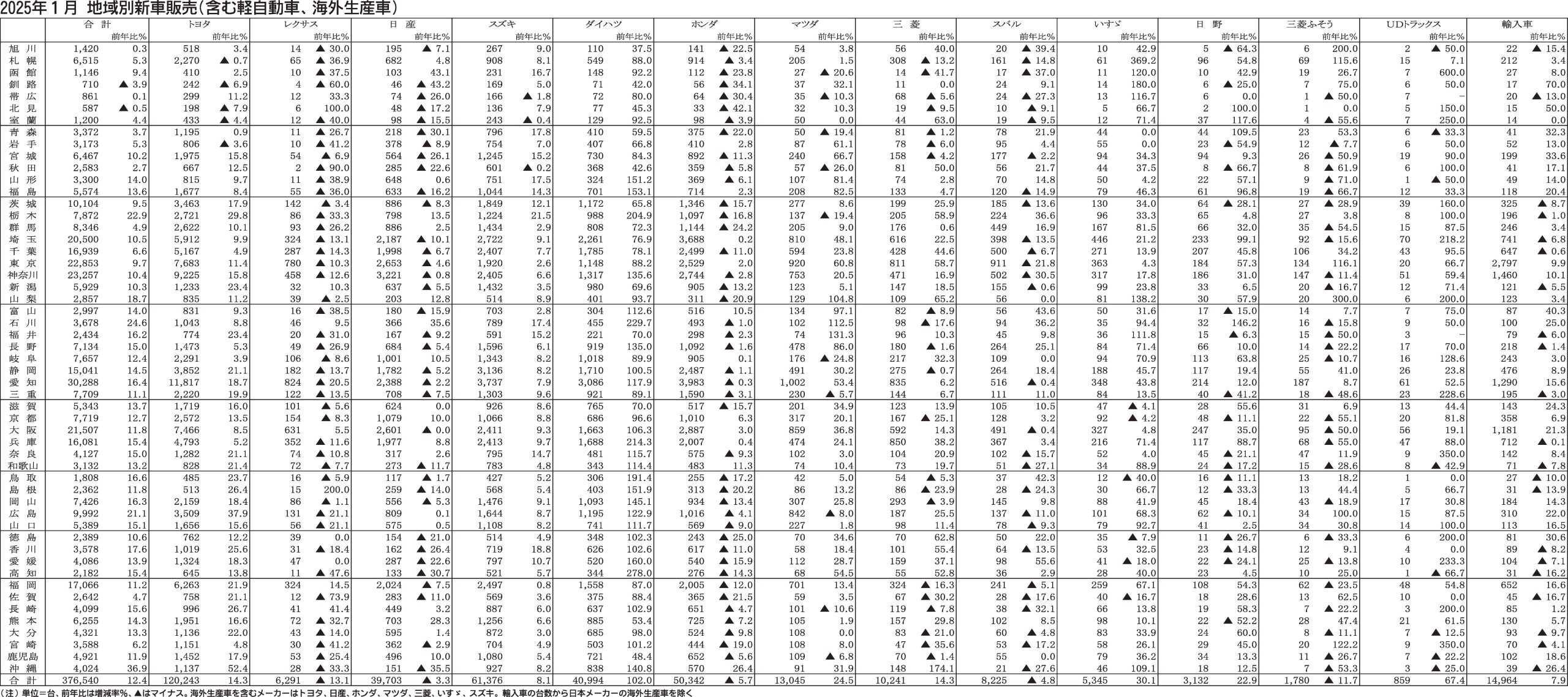〈2025年1月 地域別新車販売(含む軽自動車、海外生産車)〉
