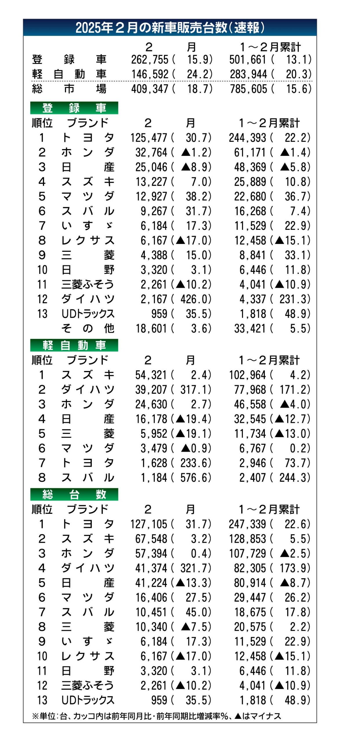 2025年2月の新車販売(登録車と軽自動車の合計)は、前年同月比18.7%増の40万9347台と、2カ月連続の前年超えとなった。前年実績が2月としては統計が残る1993年以降で最も少ない販売台数で、反動増が生じた。1月(同12.4%増)に...