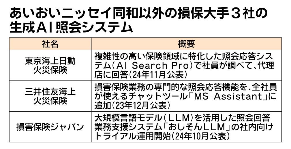 損害保険大手4社で、業務効率化を狙いに生成AI(人工知能)を活用する動きが広がっている。これまでは社内向けシステムのみだったが、あいおいニッセイ同和損害保険は代理店対応の一部への導入を発表。同社によると、損保業界で初という。業界の一連の不...