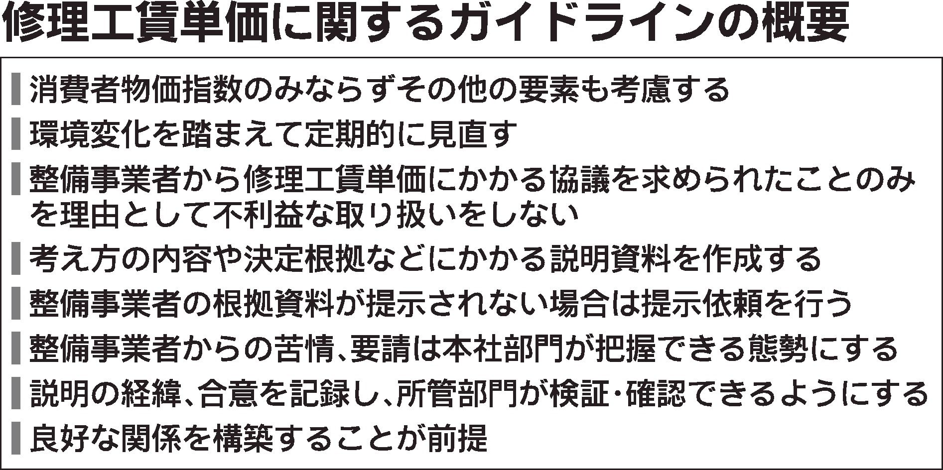 日本損害保険協会(損保協、城田宏明会長=東京海上日動火災保険社長)は4日、「修理工賃単価に関する対話・協議のあり方にかかるガイドライン」を発表した。保険修理の工賃算出に用いる「指数対応単価」はこれまで、「消費者物価指数(CPI)」を指標と...
