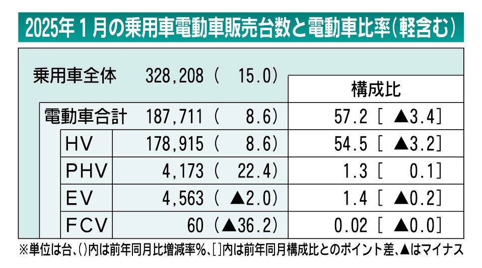 1月の国内電動車販売(乗用車)は、前年同月比8.6%増の18万7711台となり、2カ月ぶりにプラスに転じた。ハイブリッド車(HV)の納車が進んだほか、台数規模はまだ少ないものの、プラグインハイブリッド車(PHV)も前年同月に比べ、2割以上...