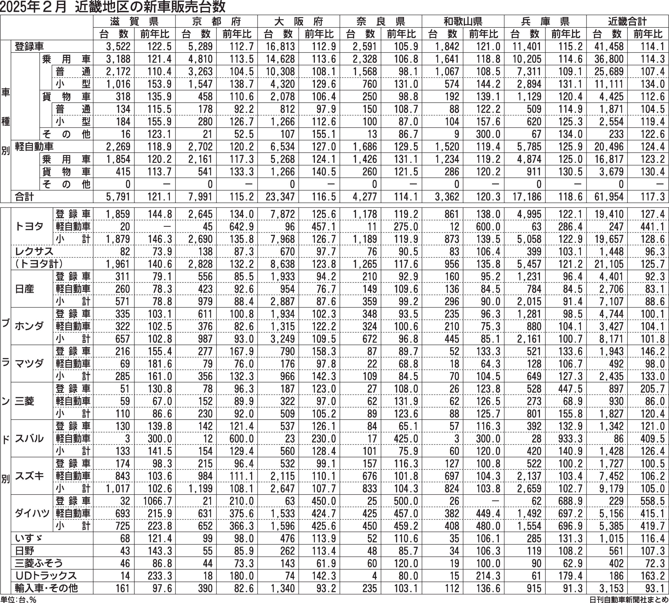 近畿2府4県の2月の新車販売台数(軽自動車含む)は前年同月比17.3%増の6万1954台となり、2カ月連続で前年を上回った。登録車は同14.1%増の4万1458台、軽は同24.4%増の2万496台で、いずれも2カ月連続の前年超えだった。前...