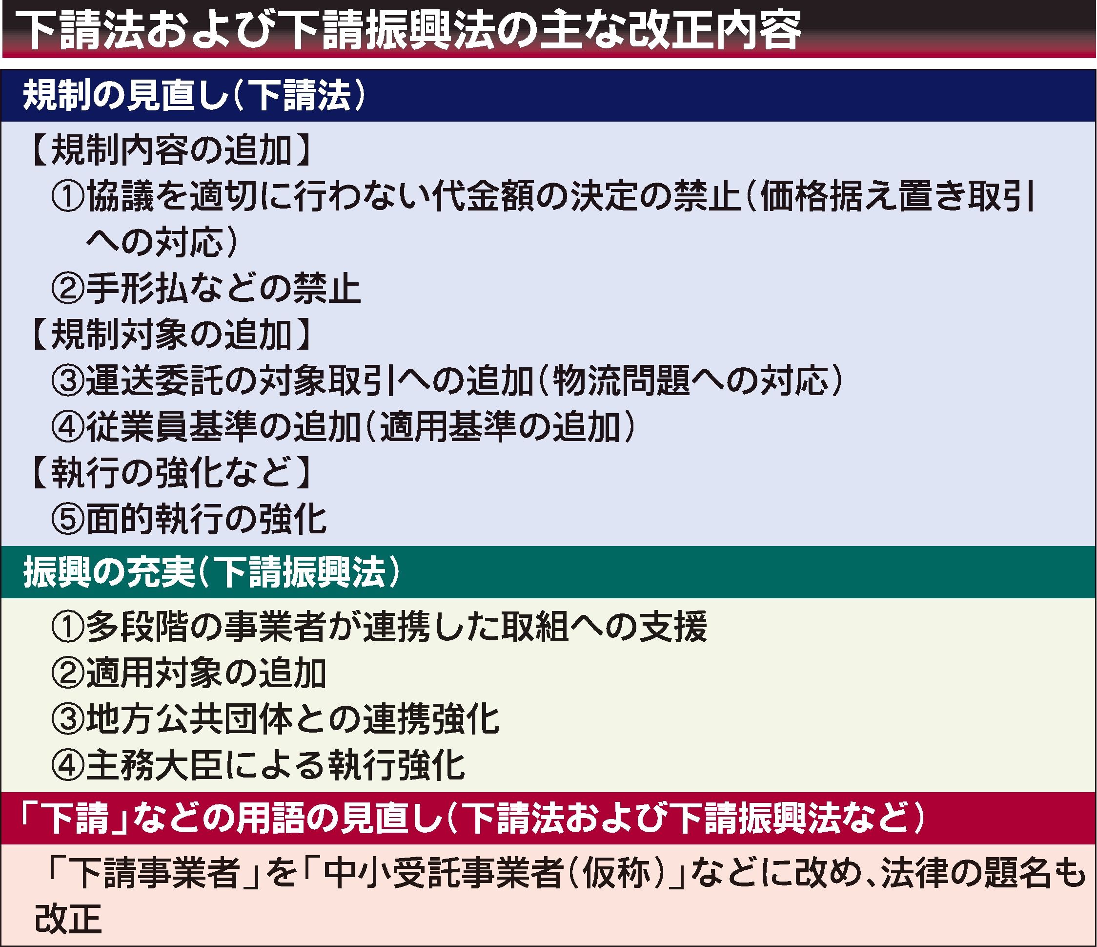下請法の改正では、規制する内容や対象を追加した。取引価格に関し、従来は「買い叩き」や発注後の減額などを規定する一方、値上げ要請には対応しにくかったという。今後は、価格交渉において必要な説明や情報提供を怠ったり、一方的に代金を決めたりすることを禁じる。また、従来は発注企業と下請け企業の区分を資本金で分類していたが、従業員数も加味して規制対象を広げるほか、仕入先を増資するなどの〝義務逃れ〟にも対処する。