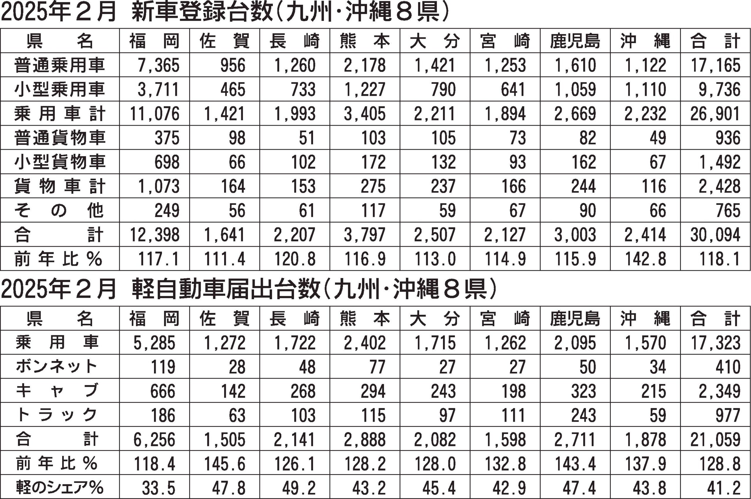 九州・沖縄2025年2月新車 2カ月連続前年超え 登録、軽とも全8県が2桁増