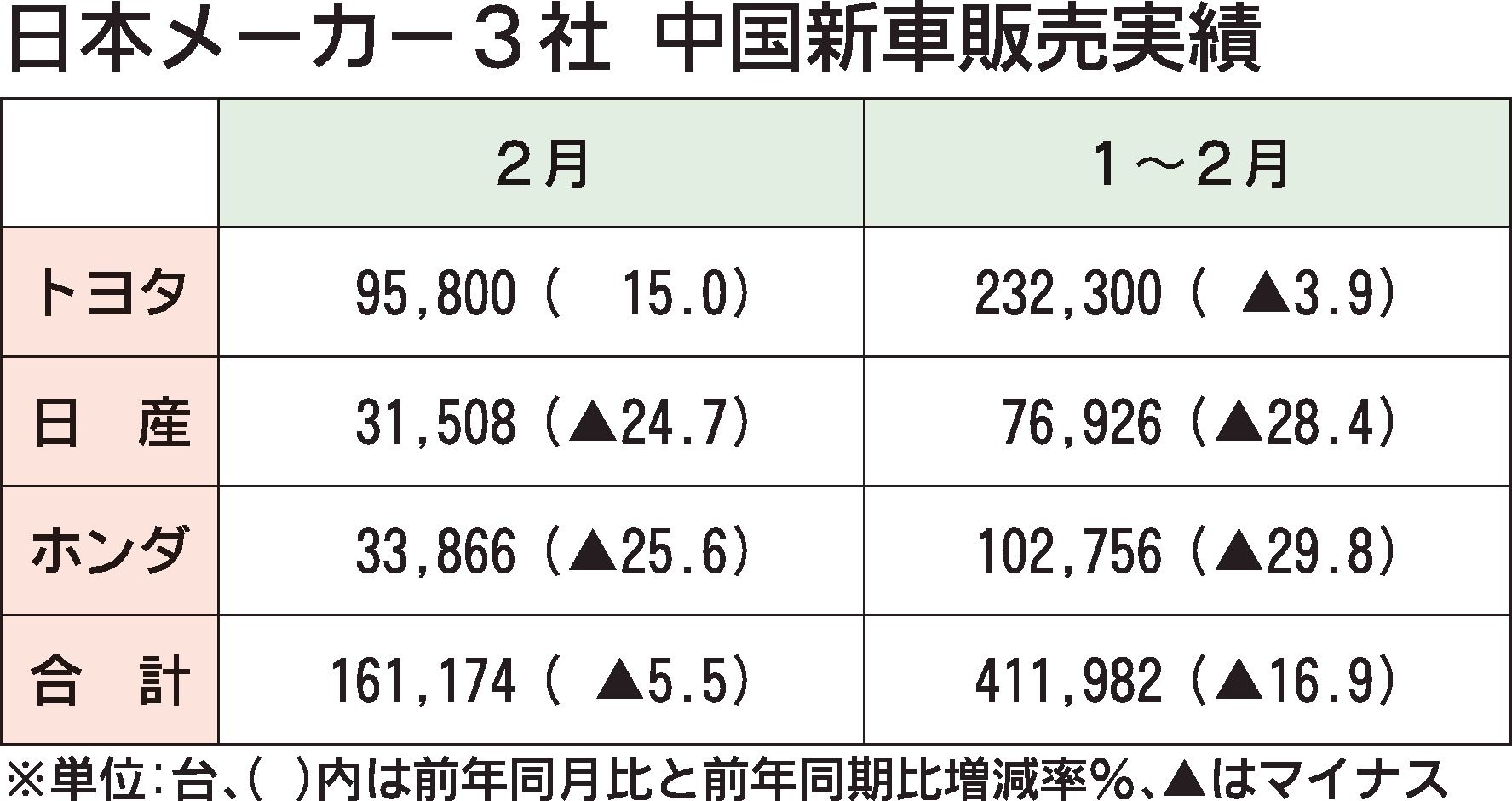 日本の自動車メーカー3社の2月の中国新車販売は16万1174台と、前年同月比5.5%減となった。前年を下回るのは13カ月連続だが、減少幅は1月(22.8%)から縮小した。 トヨタ自動車は同15.0%増の9万5800台で2カ月ぶりに増加した...