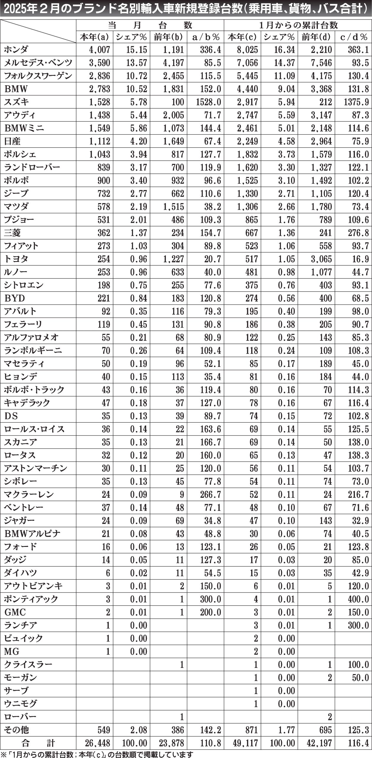 〈2025年2月のブランド名別輸入車新規登録台数(乗用車、貨物、バス合計)〉