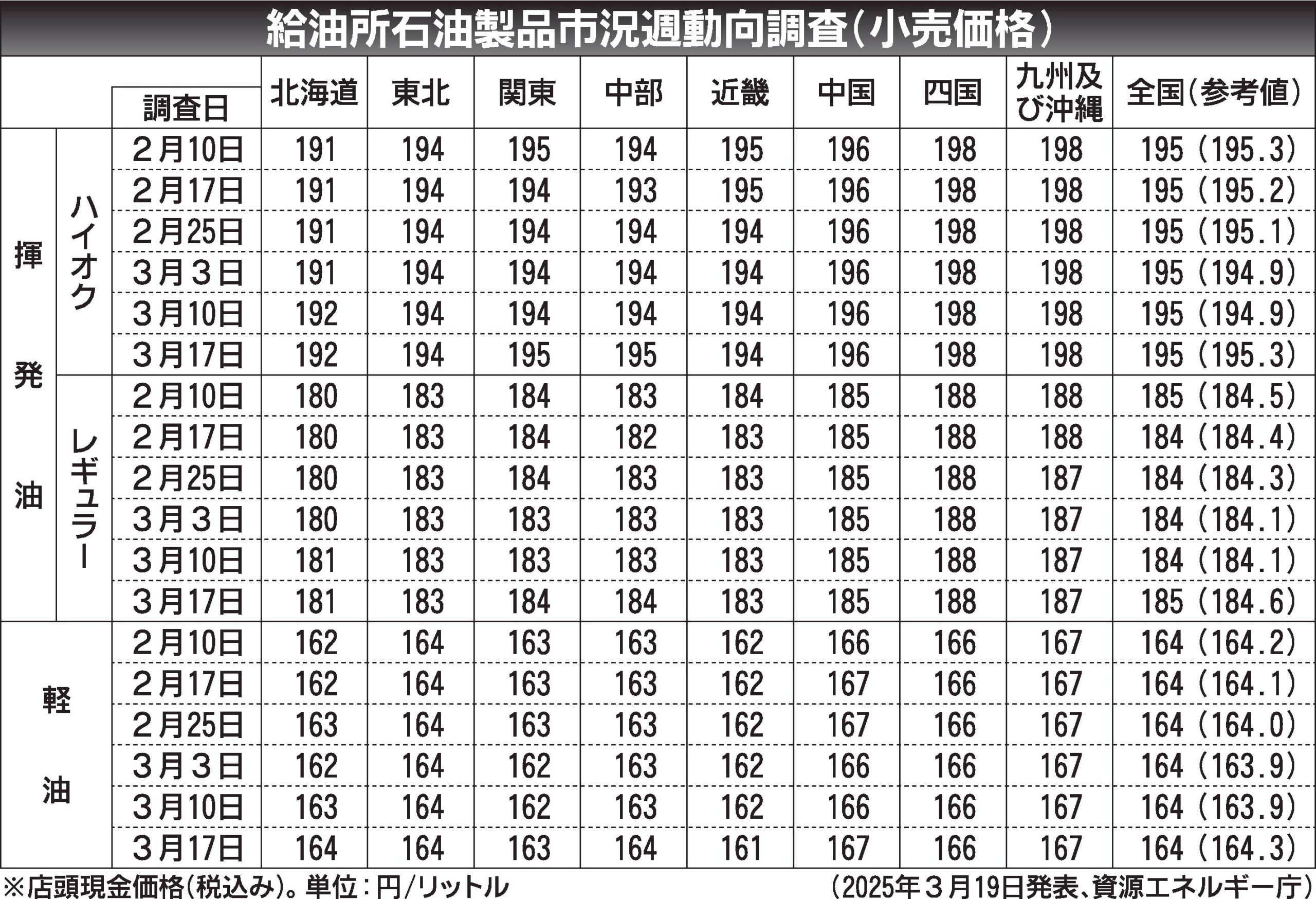 〈給油所石油製品市況週動向調査(小売価格)〉2025/2/10~3/17