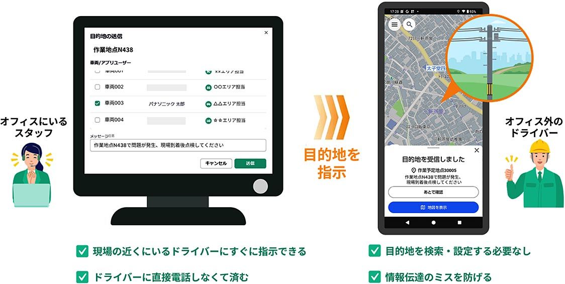 パナソニックオートモーティブシステムズ(PAS、永易正吏社長、横浜市都筑区)は、法人向けのスマートフォン用カーナビゲーションアプリ「ゴリラーダプロ」に行き先指示機能を追加したと発表した。オフィスにいるスタッフが、パソコンを通じてドライバーのアプリに目的地を設定できる。ドライバーの手間を省くほか、急な目的地変更でも情報伝達のミスを削減できる。