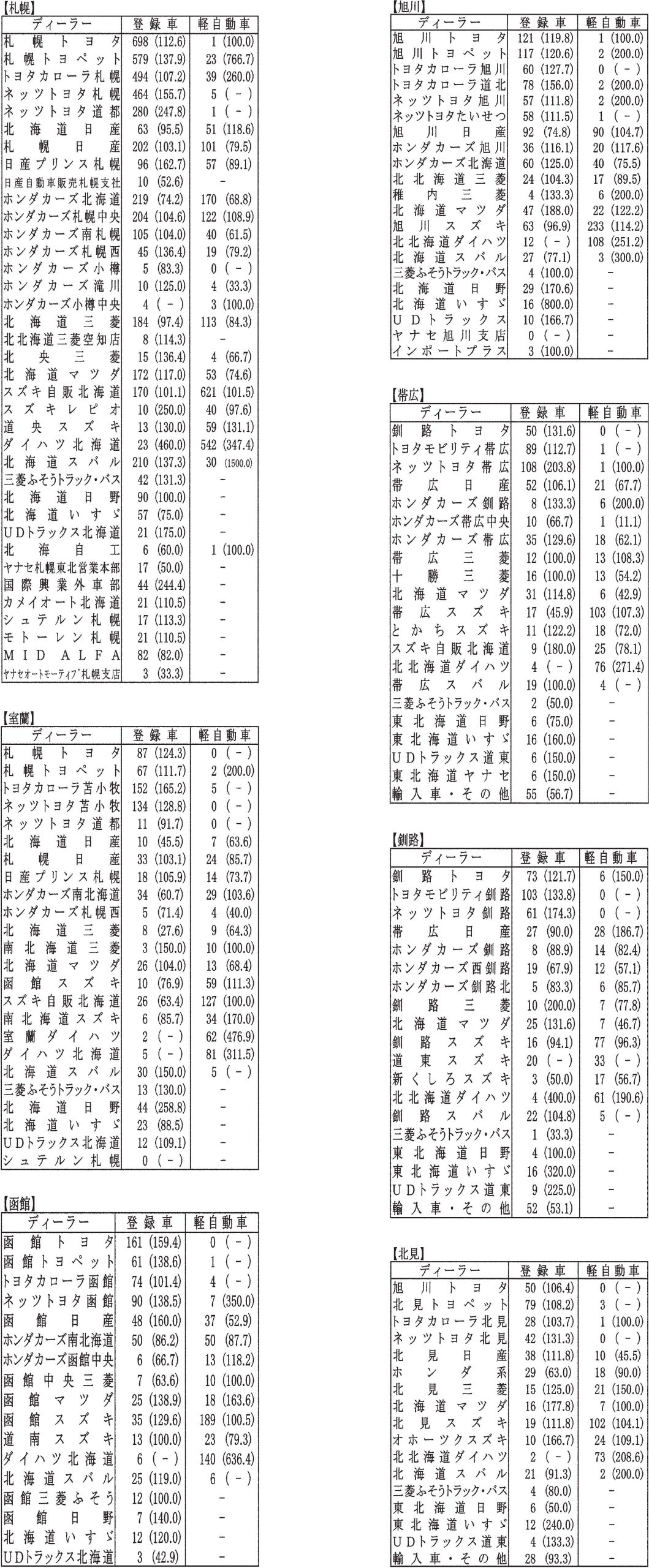 〈2月度全道管内別ディーラー別新車登録・届け出台数(カッコ内は前年同月比)〉札幌管内ホンダ系・スズキ系の登録台数は自販連正会員分