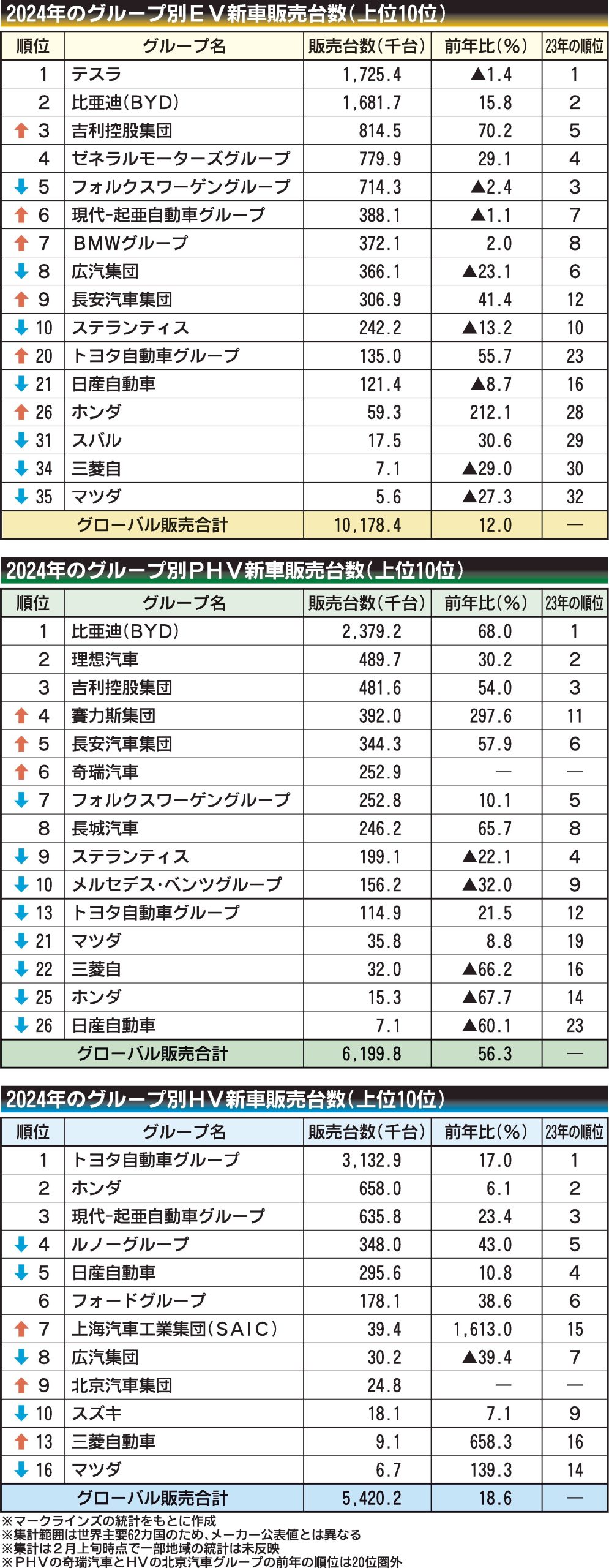 2024年の世界の電動車市場は、急成長してきた電気自動車(EV)の伸び率が減速する一方で、プラグインハイブリッド車(PHV)、ハイブリッド車(HV)がEVを上回る成長を遂げた。マークラインズの統計を基に、自動車メーカーの電動パワートレイン...