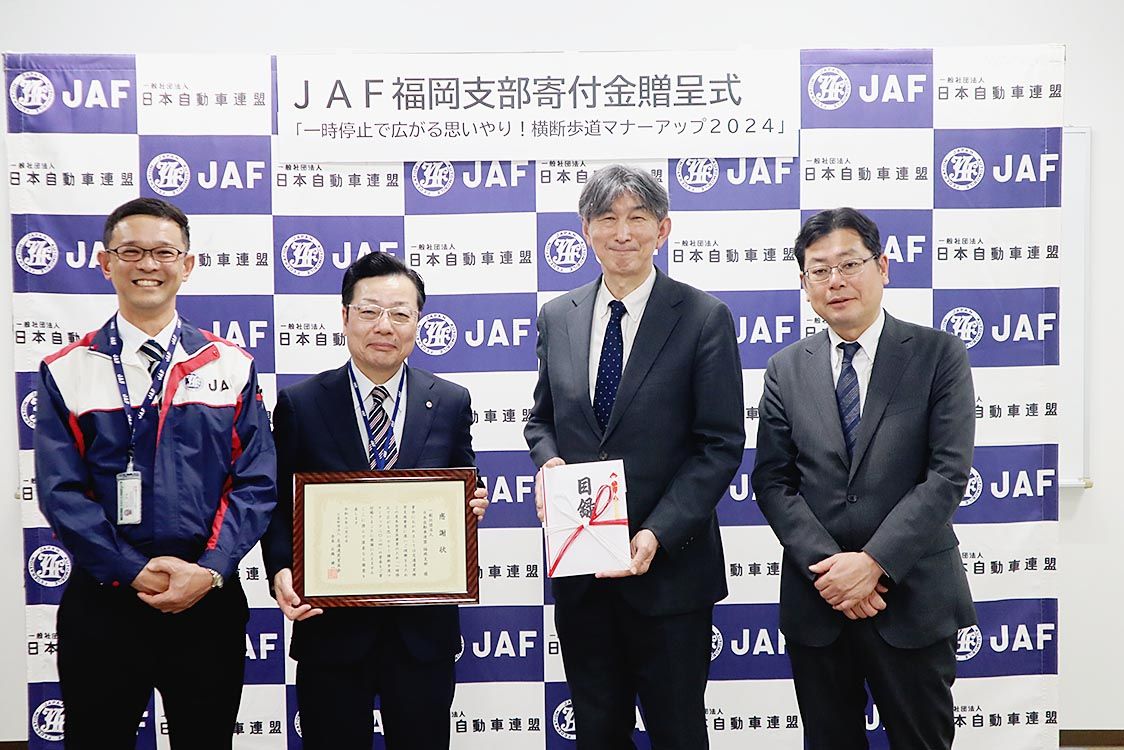 日本自動車連盟(JAF)福岡支部(内野伸一支部長)は、交通遺児育英会に12万4910円を寄付した。昨年実施した信号機のない横断歩道における歩行者優先の徹底を啓発するイベントの協賛金の一部を活用した。 啓発イベントは「歩行者が安全に横断歩道...