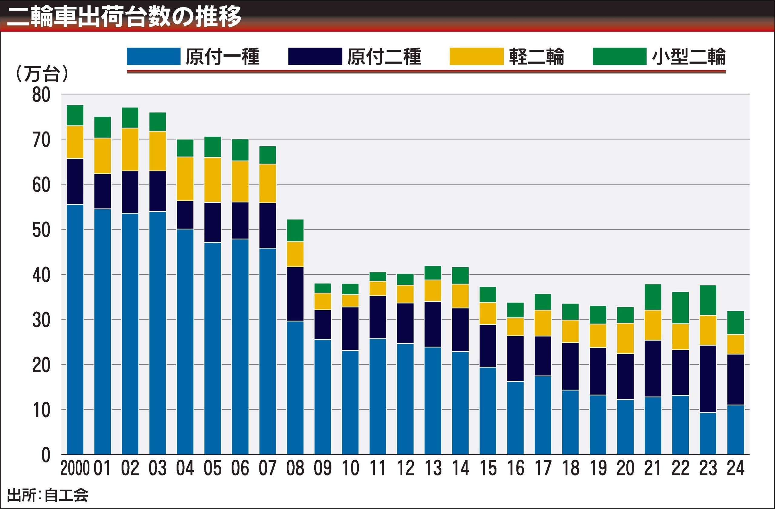 2024年の二輪車販売(出荷ベース)は4年ぶりに40万台水準を大幅に割り込んだ。特に通勤・通学やエントリー需要が多い第二種原動機付自転車(原付二種、排気量51~125cc)と二輪軽自動車(軽二輪、126~250cc以下)の落ち込みが目立っ...