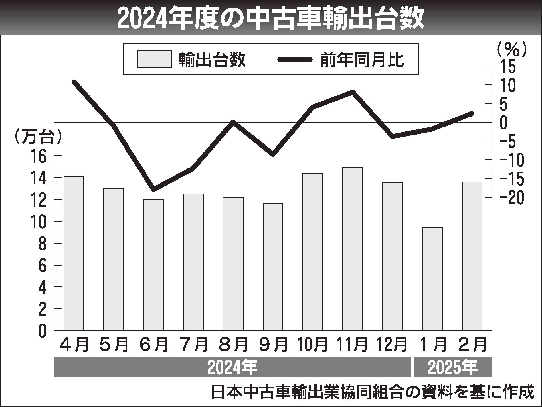 2024年度の中古車輸出台数(車両価格20万円以上)が、4年ぶりのマイナスになる可能性が高まってきた。日本中古車輸出業協同組合(JUMVEA、佐藤博理事長)の発表によると、24年4月から25年2月までの実績は前年同期比2.1%減の141万...