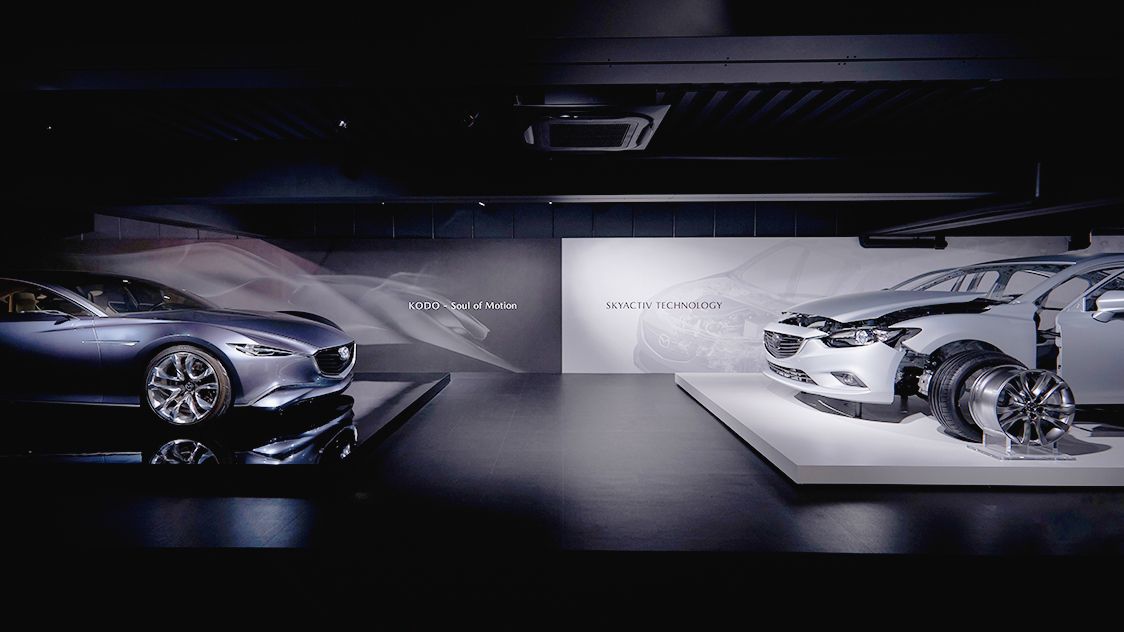 ゾーン7では、スカイアクティブ技術を搭載した車両の分解モデルやデザイン思想「魂動」のコンセプトカー「靭(SHINARI)」といった実物を展示する。エピローグゾーンにはジャパンモビリティショー2023で披露したコンセプトカー「アイコニックSP」を展示する。