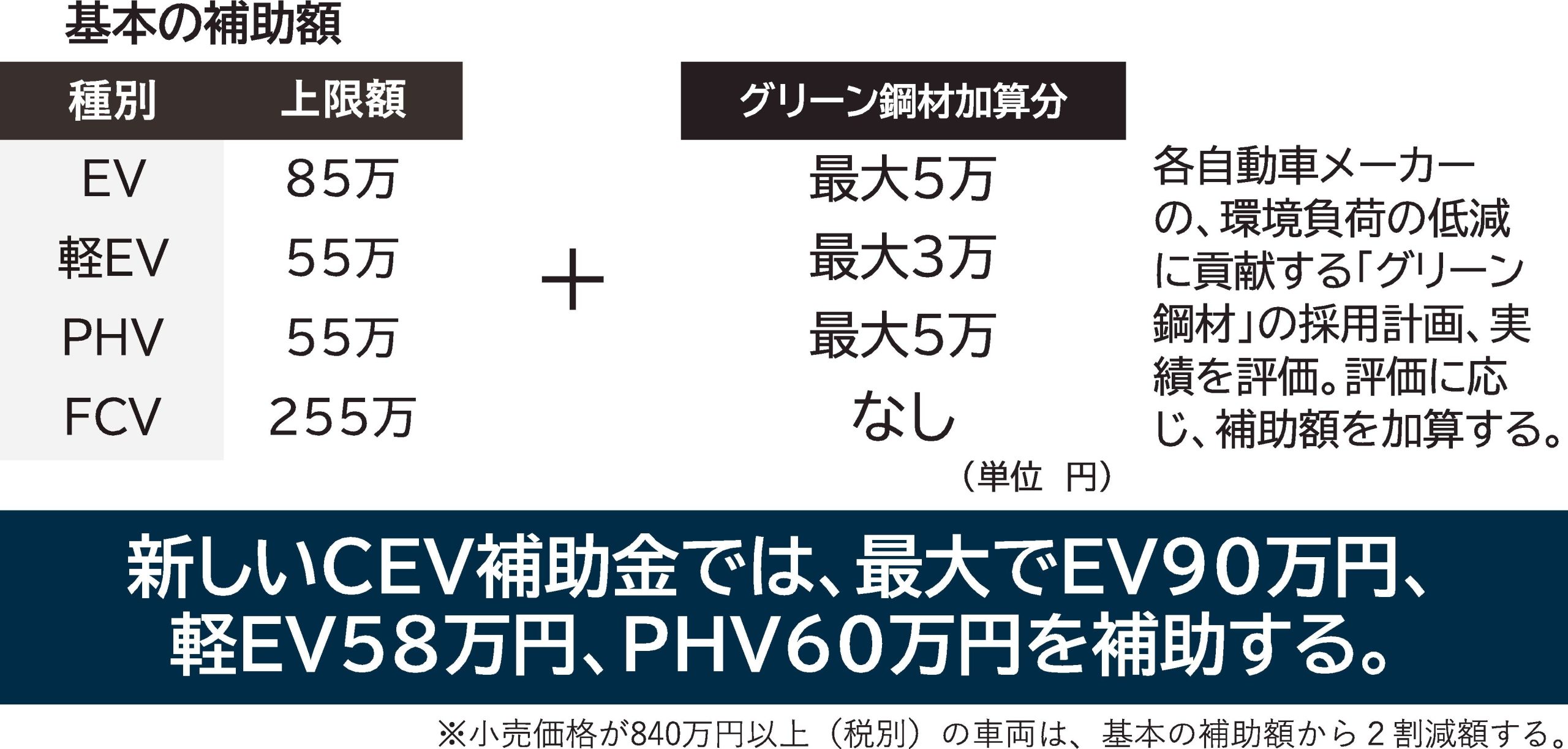 「クリーンエネルギー自動車(CEV)導入促進補助金」が4月から新しくなる。製造時の二酸化炭素(CO2)排出の少ない鋼材の普及を狙いに新たな評価項目が加わり、補助額も最大で5万円が上乗せされる。ただ、クルマの環境性能と企業の取り組みを考慮す...