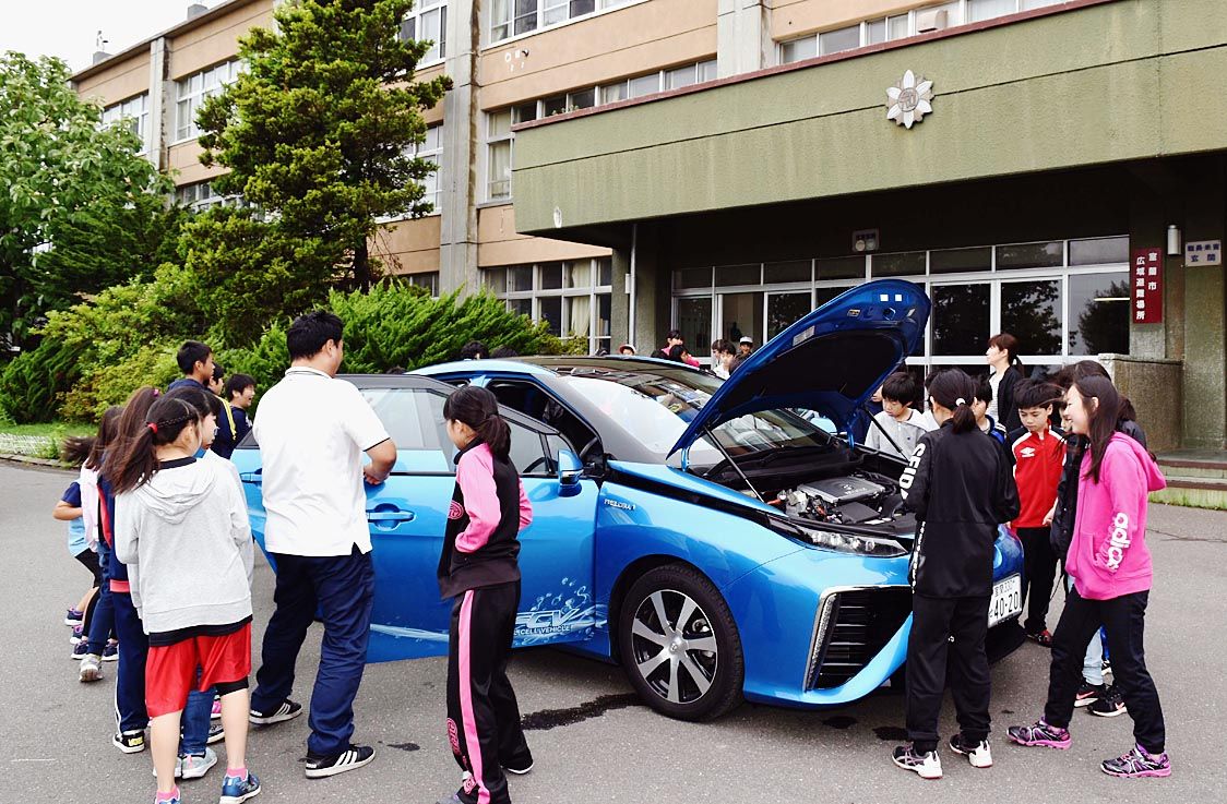 【室蘭】北海道運輸局は22日、室蘭市立知利別小学校で「交通エコロジー教室」を開催。地球温暖化の実験や燃料電池車ミライの見学などを行った=写真。 室蘭市と共同で11年前から取り組んでいる。同小学校5年1、2組の生徒55人が、地球温暖化と運輸...