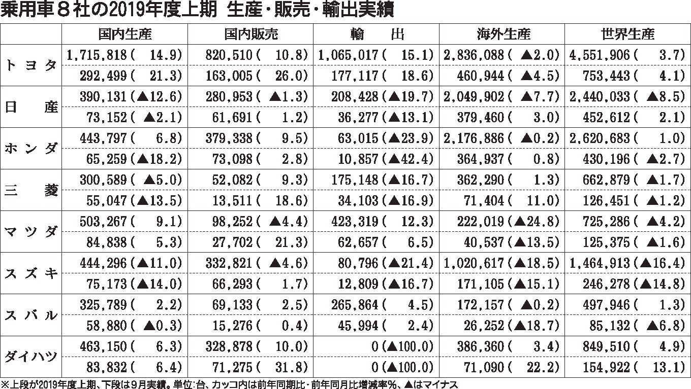 乗用車メーカー8社が30日に発表した2019年度上期(4~9月)の生産・輸出実績によると、8社合計の世界生産台数は前年同期比2・3%減の1381万3156台だった。トヨタ自動車、ホンダ、ダイハツ工業が上期として過去最高を更新したが、日産自...