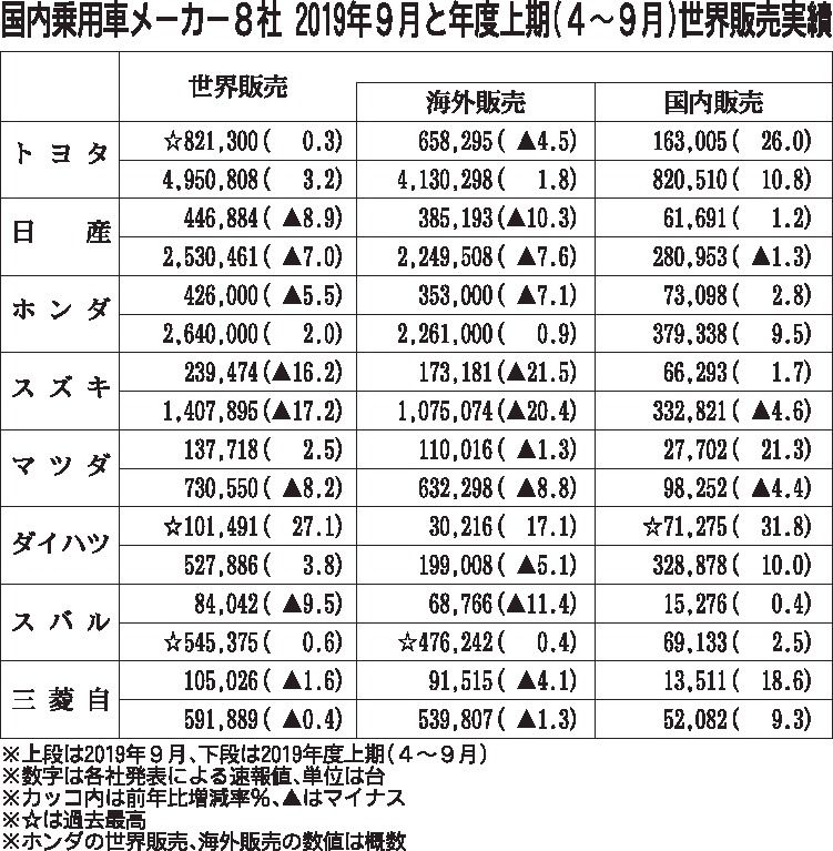 乗用車メーカー8社は30日、2019年度上期(4~9月)の世界販売実績(速報値)を発表した。合計の世界販売台数は前年同期比2・2%減の1392万4864台だった。国内市場は堅調だったが、日産自動車、スズキ、マツダ、三菱自動車の4社が米中の...
