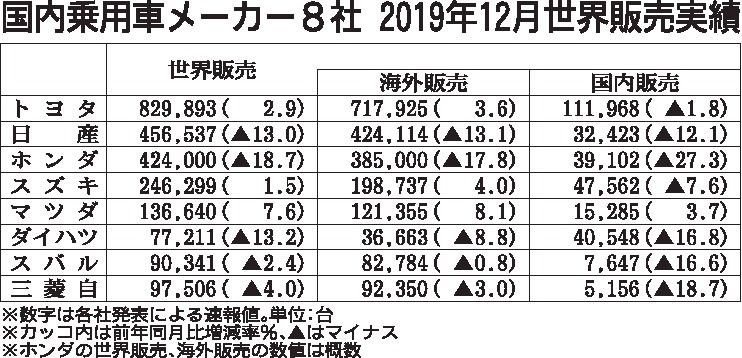 国内乗用車メーカー8社 2019年12月世界販売実績