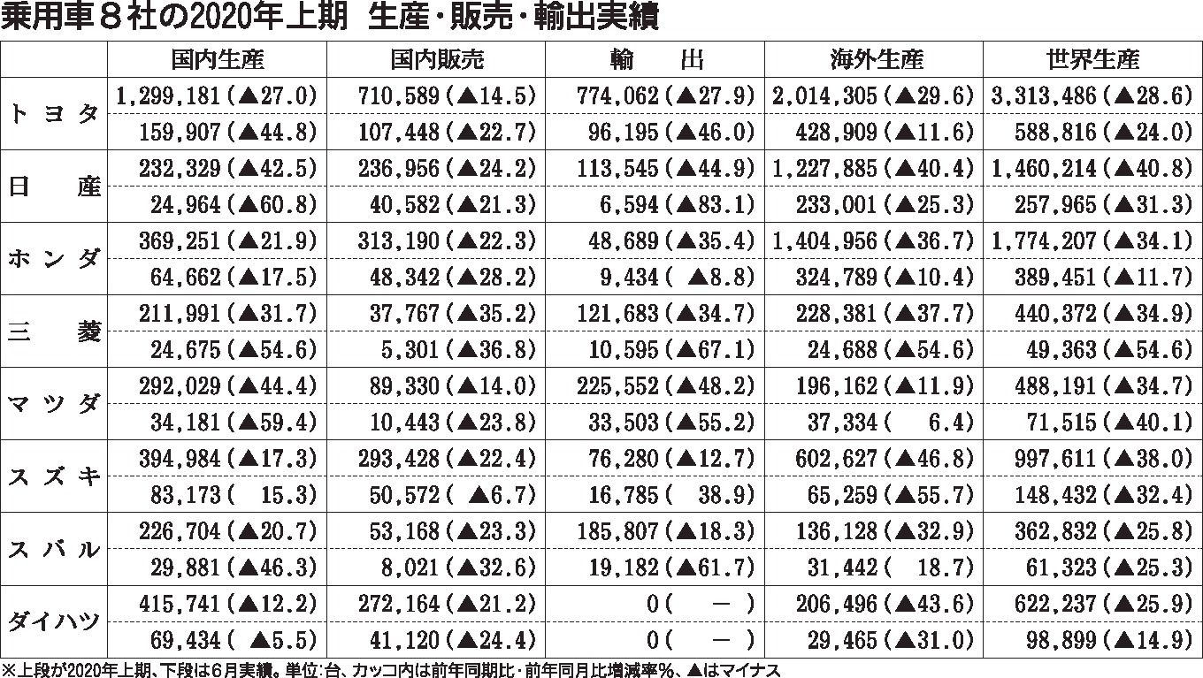 〈乗用車8社の2020年上期 生産・販売・輸出実績〉