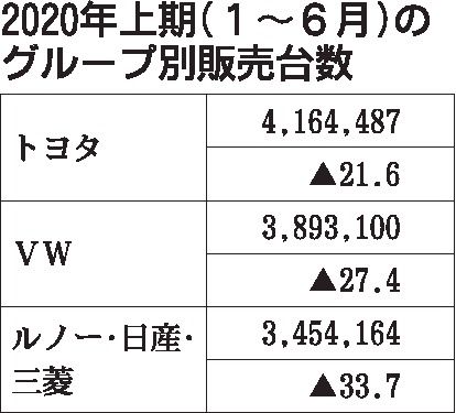 2020年上期(1~6月)の世界販売台数でトヨタ自動車(ダイハツ工業、日野自動車含む)が上期として6年ぶりに首位に返り咲いた。前年同期比21・6%減の416万4487台となり、前年首位の独フォルクスワーゲン(VW)グループを抜いた。ルノー...