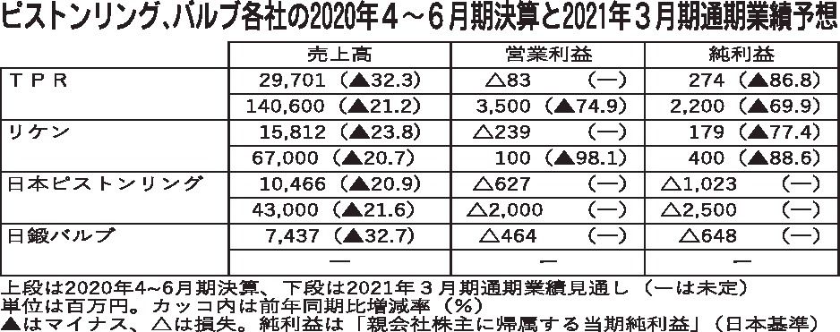 ピストンリングおよびバルブメーカー各社の2020年4~6月期 主要4社が営業赤字