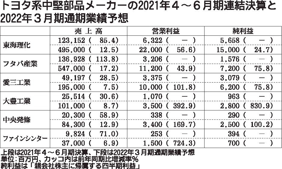 トヨタ自動車系中堅部品メーカー6社の2021年4~6月期連結業績は、売上高、営業利益ともコロナ禍前(19年4~6月期)の水準まで回復した。愛三工業はコロナ禍で新たに始めた原価低減活動が奏功し、過去最高の営業利益を確保した。全体的にトヨタ向...