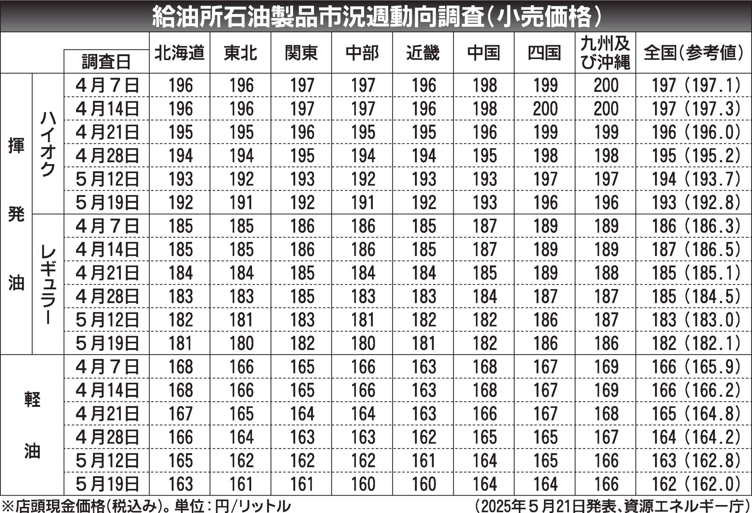 〈給油所石油製品市況週動向調査(小売価格)〉2025/4/7~5/19