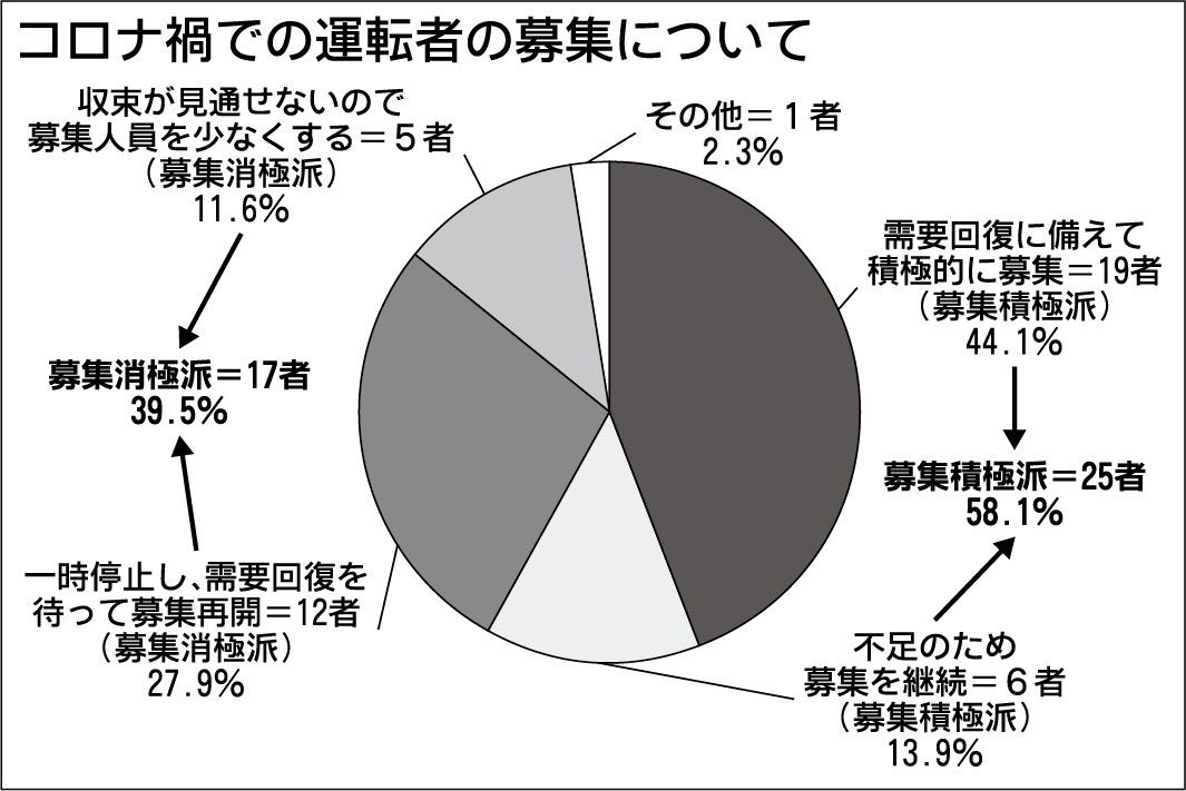 運転者の募集については、需要回復を見込むことや現状の人手不足を理由に募集を進めるという「募集積極派」が25者、コロナ禍収束が見通せず、募集人員を減らすほか需要回復を待って再開を考えるという「募集消極派」が17者だった。