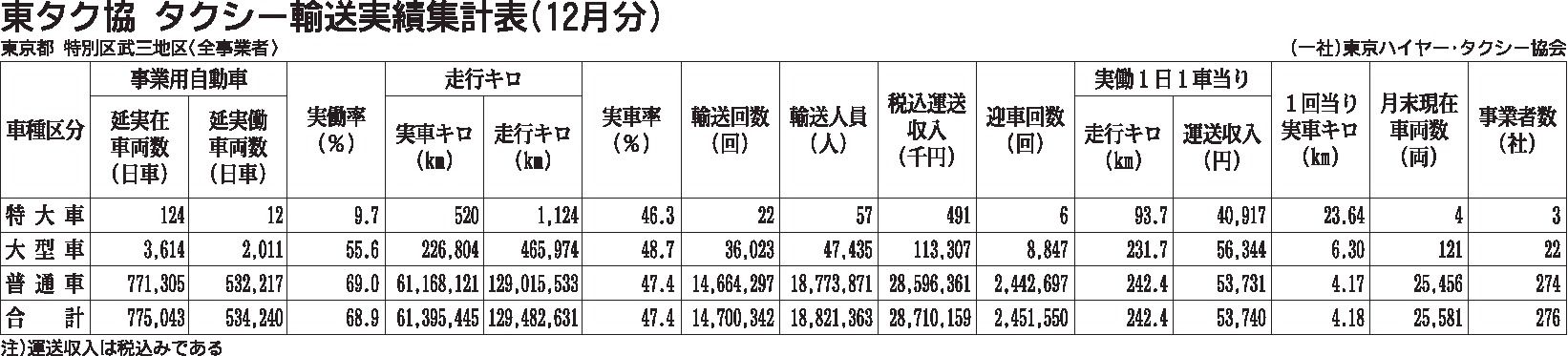 東京ハイヤー・タクシー協会はこのほど、2021年12月分の輸送実績集計(確定値)を発表した。特別区武三地区の全事業者(276社)の実働率は前年同月比増減なしの68・9%だった。...
