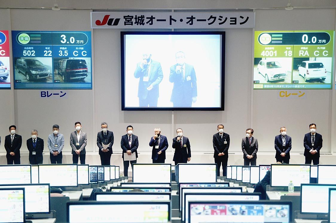 【仙台】JU宮城(伊藤行雄理事長)は、大和町の中古車オークション(AA)会場で「年度末謝恩AA」を開催した=写真。1700台を超える出品台数を集め、盛況な競りが展開された。 伊藤理事長はAA開始前のあいさつで「令和3年度は累計で約6万7千...
