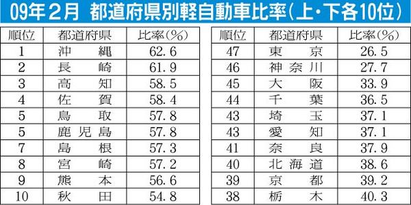 2009年2月の軽自動車販売比率、全国平均は過去最高の42.7%
