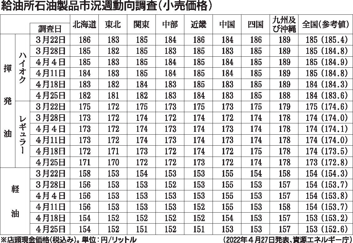 〈給油所石油製品市況週動向調査(小売価格〉〉2022/3/22~4/25