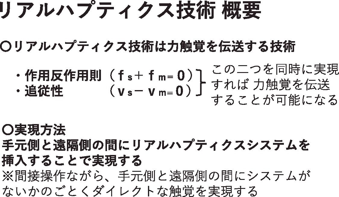 振動などを利用して、人に実際のものに触れているかのような感触を与える技術。ゲーム機のコントローラーなどに採用されるが、ほとんどが機器からユーザーにイベントの発生などを告知する「単方向」の機能にとどまる。 大西特任教授らが研究開発を進めてい...