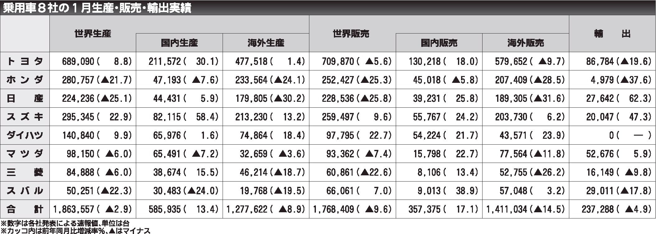 乗用車メーカー8社が27日に発表した1月の世界生産台数は前年同月比2・9%減の186万3557台と3カ月連続で減少した。国内は新型コロナウイルスの感染拡大や半導体不足で低水準だった前年の反動で同13・4%増と2カ月ぶりに増加したが、海外は...