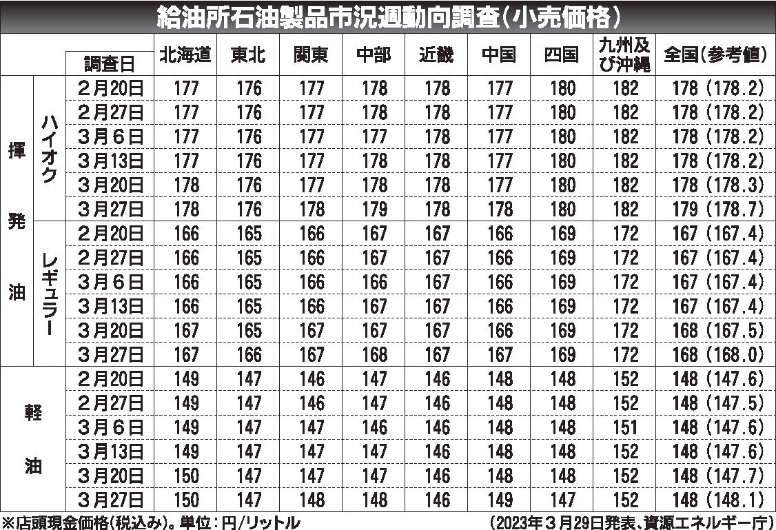〈給油所石油製品市況週動向調査(小売価格)〉2023/2/20~3/27