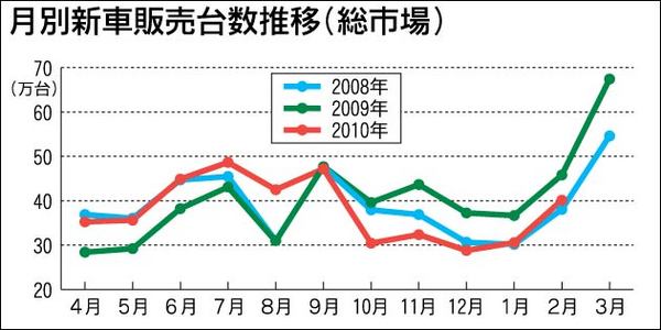 「歴史上、初めて上半期と下半期のボリュームが逆転する年になる」(自動車メーカー幹部)と見られていた2010年度の国内新車市場。各社の予測通り、エコカー補助金終了を境に環境が一変し、新車販売は9月から2月まで6カ月連続の前年割れが続いている...
