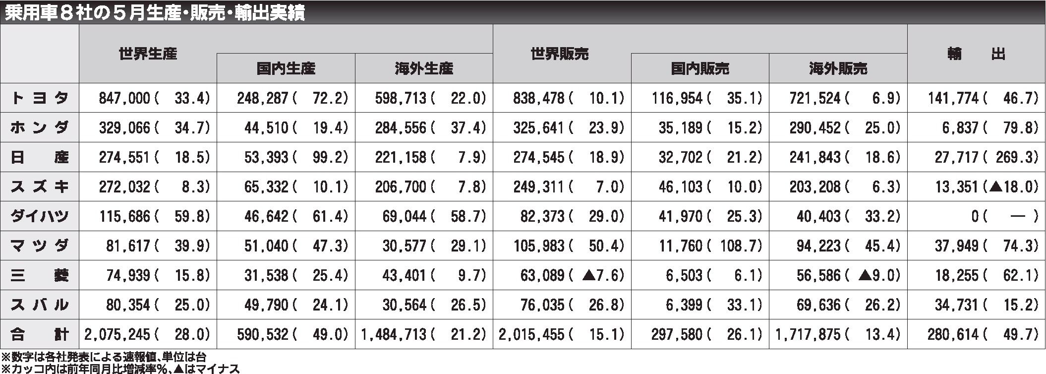 乗用車メーカー8社の5月の世界生産台数は、前年同月比28・0%増の207万5245台となり、4カ月連続で増加した。上海市のロックダウン(都市封鎖)の影響で前年水準が低かったことに加え、半導体不足の緩和傾向や新型車効果などで全社の生産実績が...