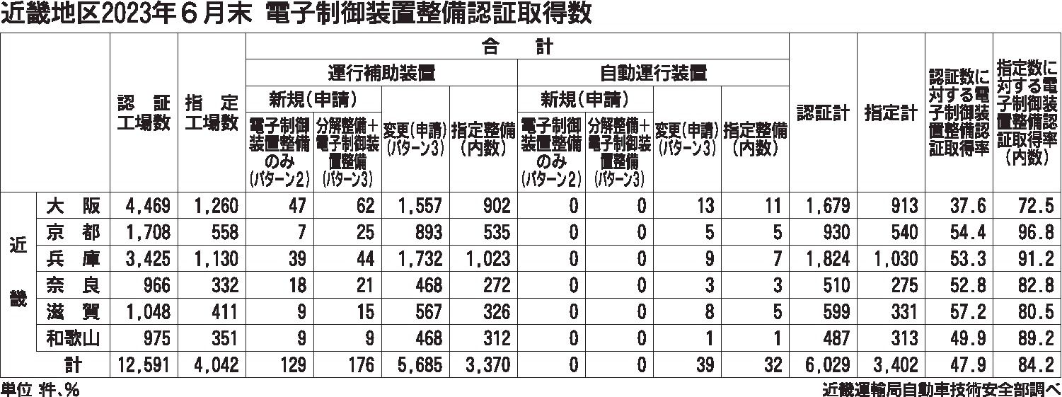 近畿地区でも特定整備制度で先進運転支援システム(ADAS)搭載車のエーミング(機能調整)作業などを行う「電子制御装置整備」認証の取得者数が伸び悩んでいる。6月末の取得者数は前年同月比20・6%増の6029件だった。2020年4月の道路運送...