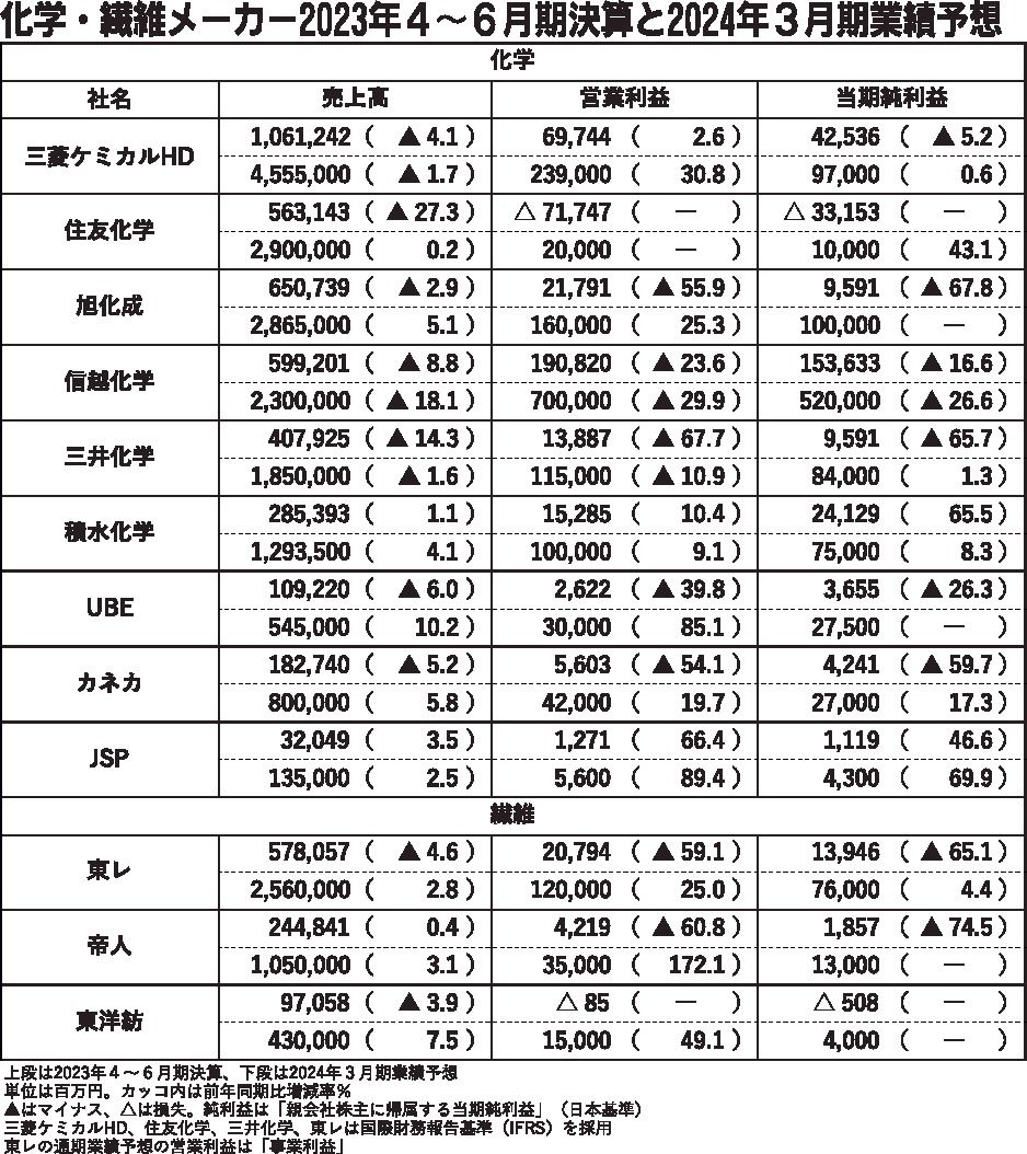 化学・繊維メーカー12社の2023年4~6月期決算、通期予想を3社が引き下げ 欧米や中国の需要減速で