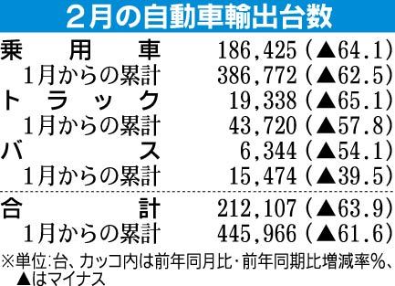 日本自動車工業会(自工会、青木哲会長)は3月30日、2月の生産・輸出実績を発表した。世界的な需要縮小で2月の国内生産は前年比56・2%減の48万1396台となり、1966年の統計開始以来全期間を通じた最大の下落率を4カ月続けて更新。200...