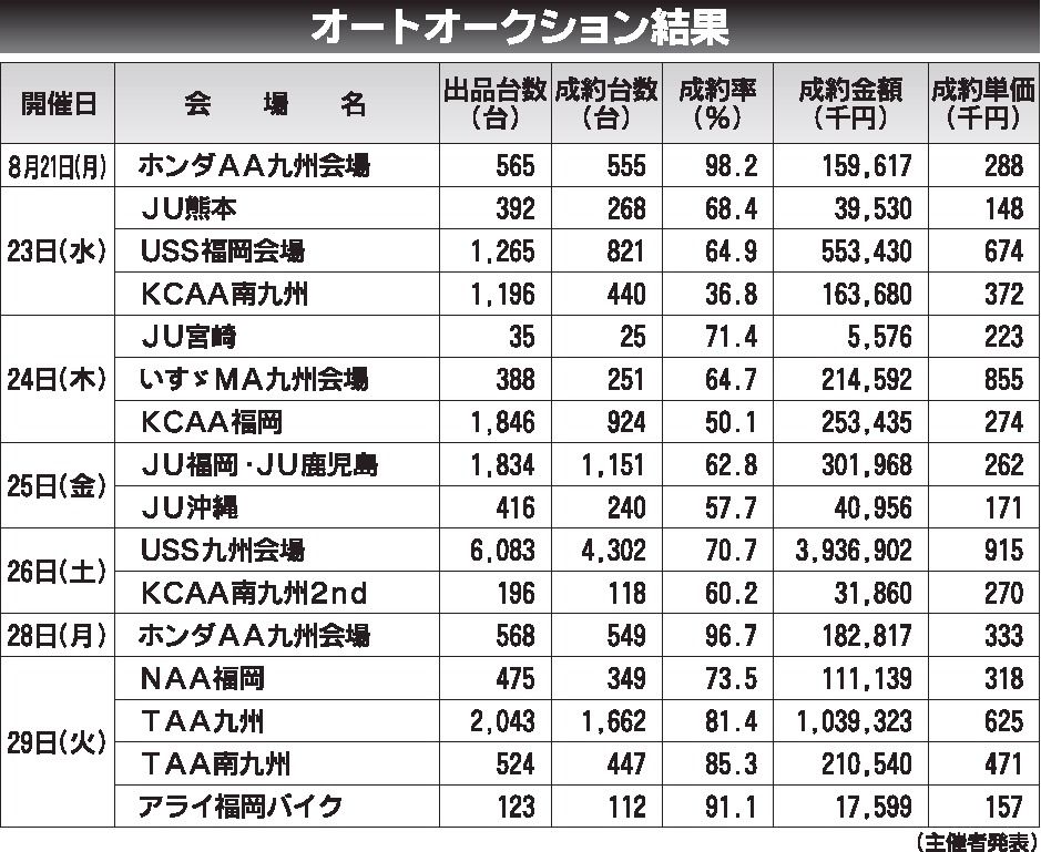 〈オートオークション結果〉九州地区 2023/8/21~29