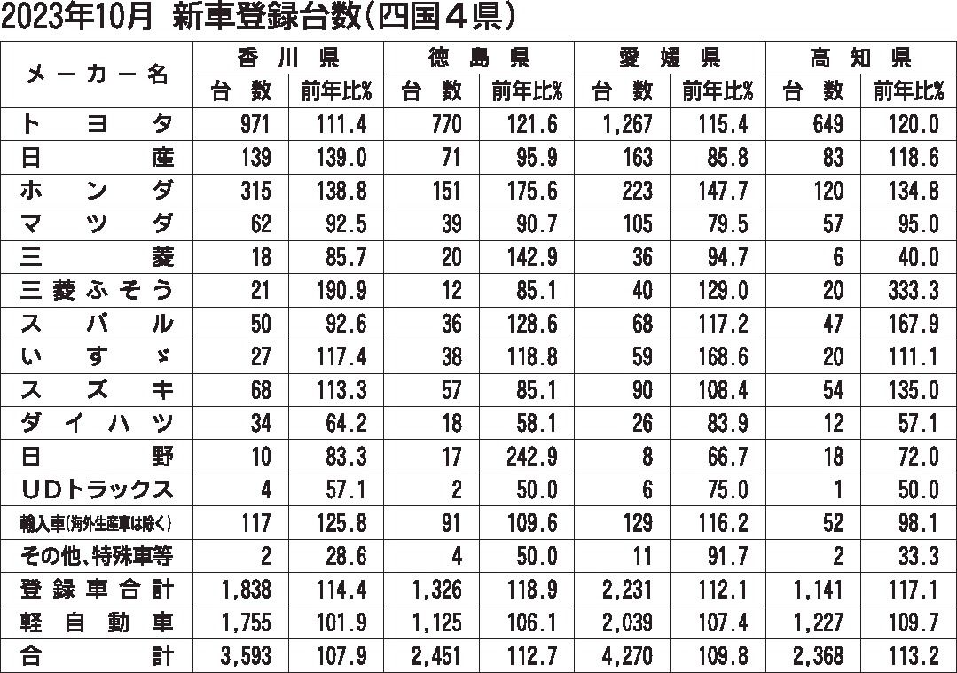 四国地区2023年10月の新車販売台数(含軽自動車)は、前年同月比10・4%増の1万2682台となり、14カ月連続で増加した。登録車、軽自動車とも前年を上回り、引き続き新車生産の回復が追い風となっている。 登録車は6536台で同14・9%...