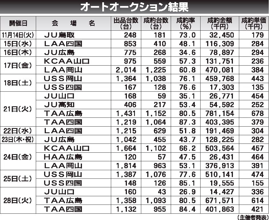 〈オートオークション結果〉中四国地区 2023/11/14~28