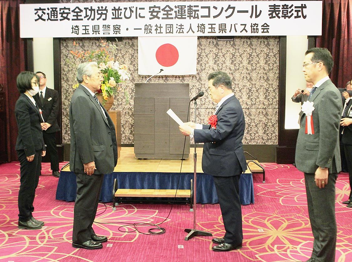 【さいたま】埼玉県警察本部と埼玉県バス協会(金井応季会長=東武バスウエスト社長)は、さいたま市浦和区内で「交通安全功労並びに安全運転コンクール表彰式」を行った。交通安全功労では「観光バス交通安全アドバイス制度」で交通安全意識普及の功労が認...