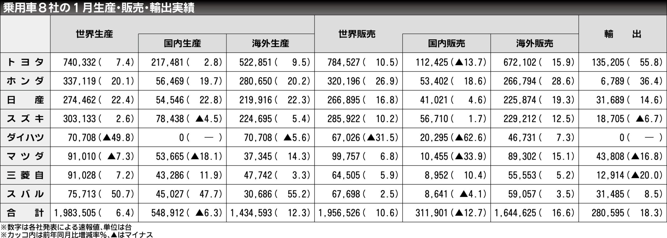 乗用車メーカー8社が28日に発表した1月の世界生産台数は、前年同月比6・4%増の198万3505台となり、12カ月連続で増加した。半導体不足による影響が緩和したことで、生産の回復が続いている。ただ、国内生産は、認証不正によりダイハツ工業が...