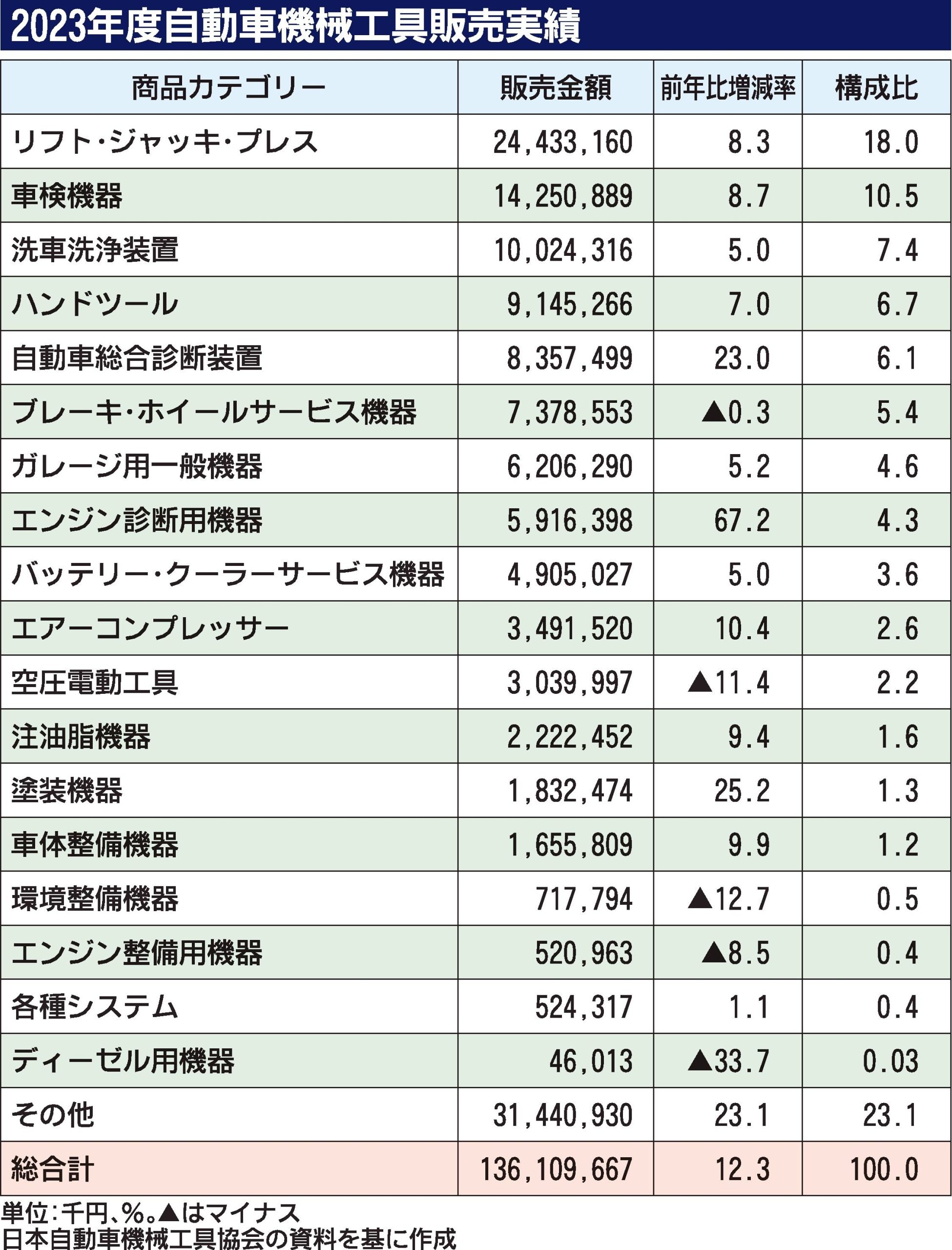 日本自動車機械工具協会(機工協、柳田昌宏会長)がまとめた2023年度「自動車機械工具販売実績」によると、商品カテゴリー19項目のうち14項目が前年を上回った。22年度に比べ、前年超えが3項目増えた。整備業界では人手不足が深刻になっており、...