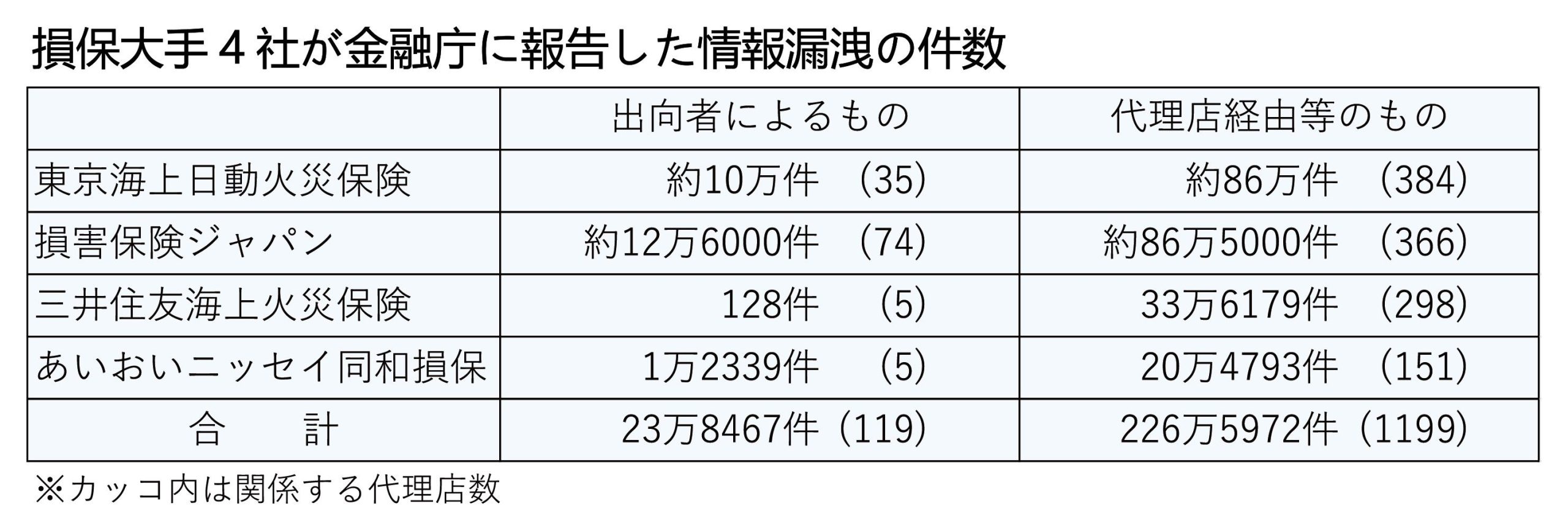 一連の情報漏洩問題は2種類ある。1つ目は損保からの出向者が出向元の損保に漏洩したもので、合計で約24万件(関係代理店数は119)あった。